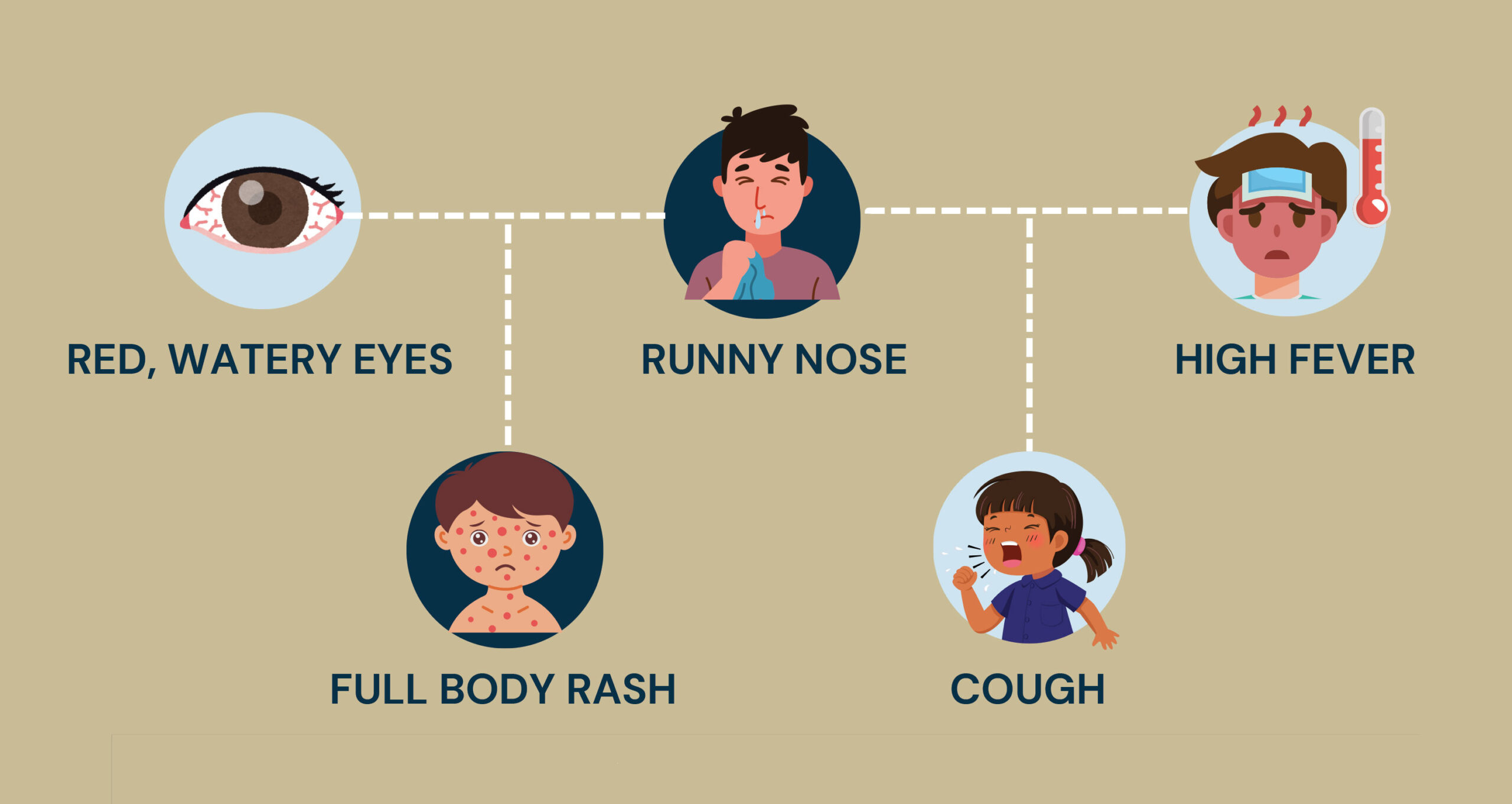 Early symptoms typically appear seven to 14 days after exposure and often mimic a common cold or flu. Measles typically causes: